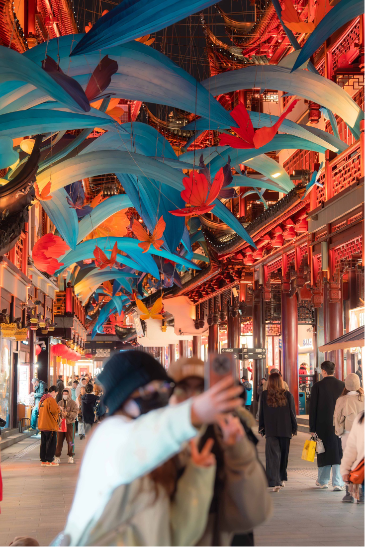 豫园凝晖路上,游客正在与“逍遥物外 庄周梦蝶”灯组合影。