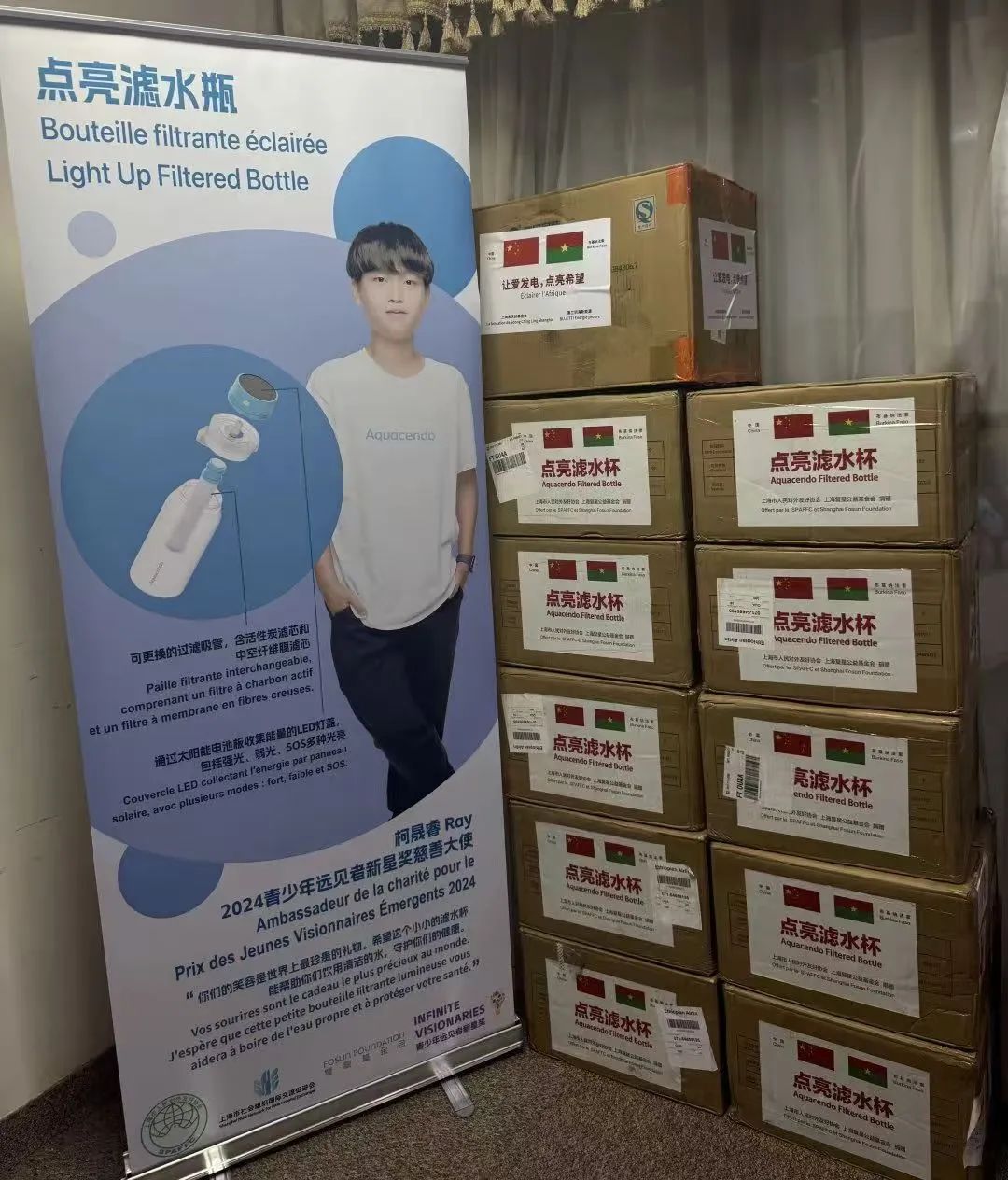 由2024青少年远见者新星奖“慈善大使”柯晟睿设计的“点亮滤水瓶”捐赠给非洲内陆国布基纳法索的儿童
