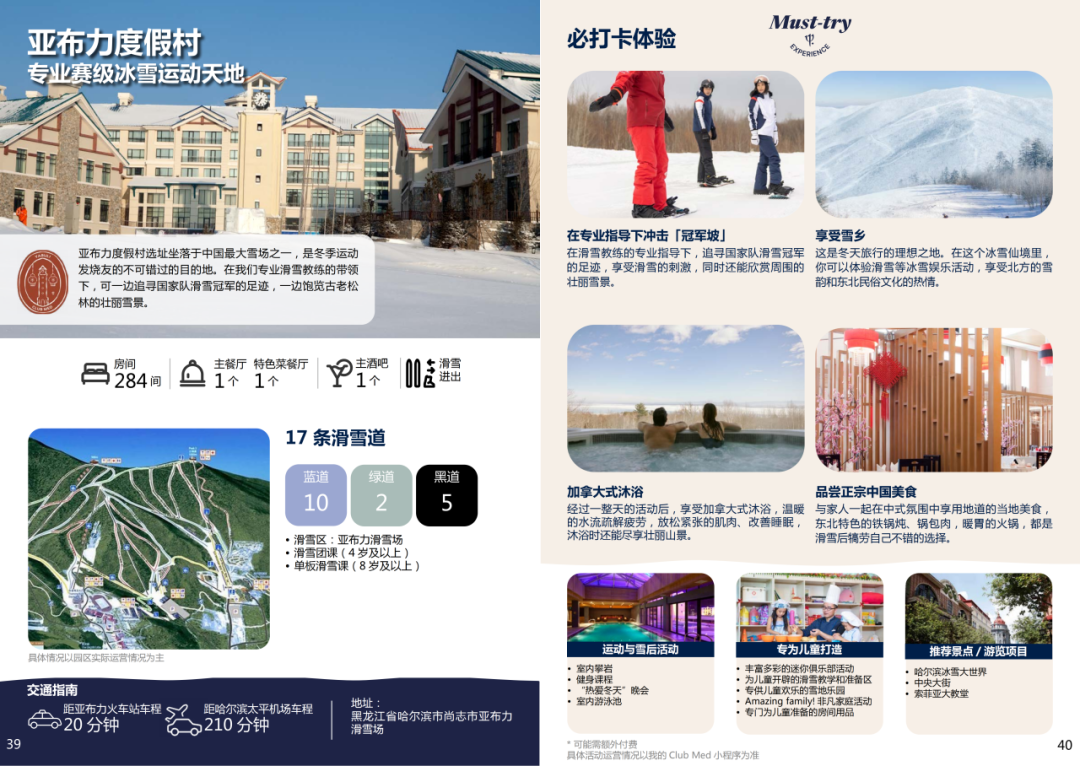 地中海俱乐部三家位于中国的滑雪度假村均坐落于知名滑雪胜地并各具特色,除专业的滑雪体验外,宾客还可享受多样化的“雪后时光”。