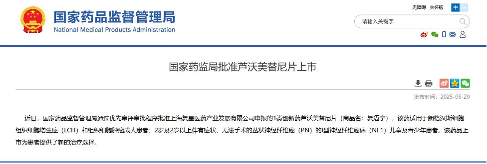 5月29日,非凡 医药宣布,自主研发的1类新药芦沃美替尼片(商品名:复迈宁®;项目代号:FCN-159)正式获得国家药品监督管理局(NMPA)批准上市。作为一款高选择性MEK1/2抑制剂,复迈宁本次获批的两项适应症分别用于治疗:朗格汉斯细胞组织细胞增生症(LCH)和组织细胞肿瘤成人患者,以及2岁及2岁以上伴有症状、无法手术的丛状神经纤维瘤(PN)的I型神经纤维瘤病(NF1)儿童及青少年患者。复迈宁的双适应症获批填补了相关罕见肿瘤领域的治疗需求,为患者提供了新的治疗选择。