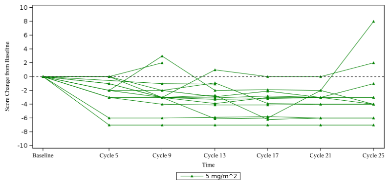 在 14 例可评估疼痛的患者中(即基线总体肿瘤疼痛评分≥2且至少有一次基线后评估的患者),与基线相比,中位最大疼痛降低分数的变化为-3.5分。13例(92.9%)患者的疼痛评分至少降低2分,达到了临床意义的改善。11例(78.6%)患者的疼痛评分为0,即疼痛完全消失。