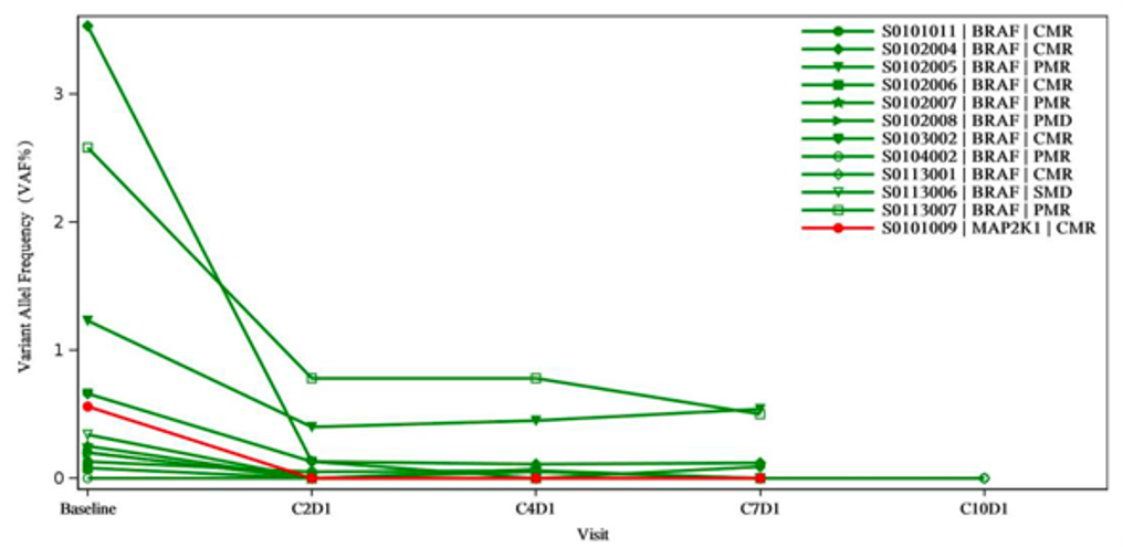 图2. cfDNA中MAPK通路变异等位基因频率(VAF %)的动态变化