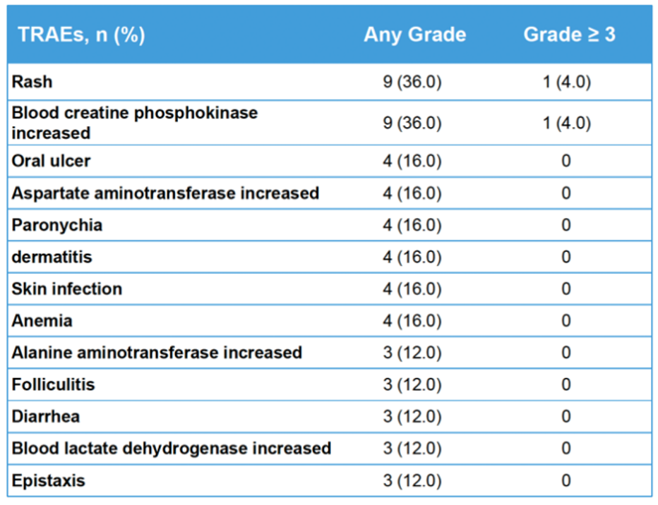 安全性和耐受性分析显示,最常见的药物治疗相关不良事件(TRAE)依次为皮疹(36.0%)、血液肌酸磷酸激酶升高(36.0%)、口腔溃疡(16.0%)、天冬氨酸氨基转移酶升高(16.0%)、甲沟炎(16.0%)、皮炎(16.0%)、皮肤感染(16.0%)和贫血(16.0%)。2例患儿(8.0%)出现≥3级的TRAE(肌酸磷酸激酶升高和皮疹各一例)。20.0%和12.0%的患儿分别报告了导致暂停用药和剂量降低的TRAE。未发现引起停药的TRAE或严重TRAE (表2)。