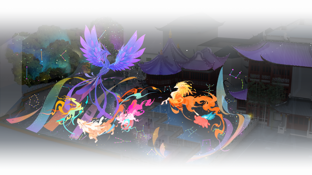 九曲桥整片区域幻化为星辰旷野,源自《山海经》的迅疾神兽,于星辰大海间恣意飞驰、奔腾汇聚、蜕变换形。喻示着每一个逐梦者,都可在无疆旷野中恣意飞舞,于追寻中蜕变成心之所向的模样。