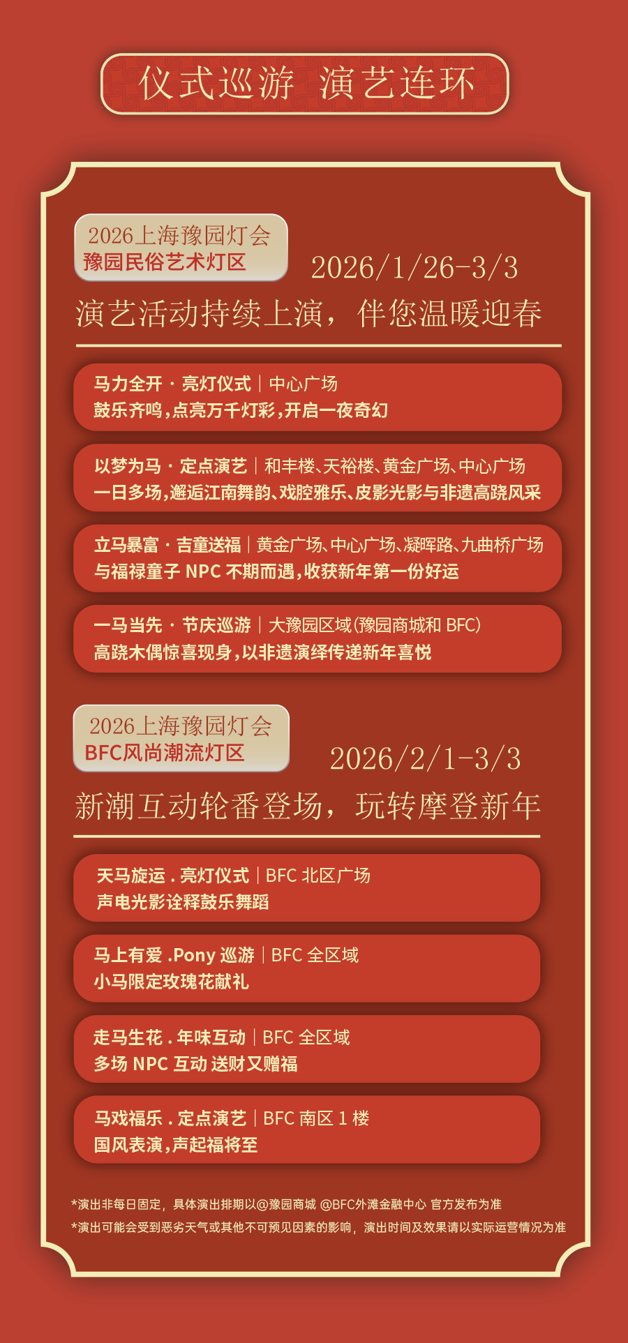 不止互动玩法,在2026上海豫园灯会期间还能享受36天不间断的精彩演艺盛宴,从豫园民俗艺术灯区内的「马力全开·亮灯仪式」、「一马当先·节庆巡游」、「立马暴富·吉童送福」、「以梦为马·定点演艺」,到BFC外滩金融中心的小马Pony巡游、NPC年味互动等新潮演出,沉浸感直接拉满。
