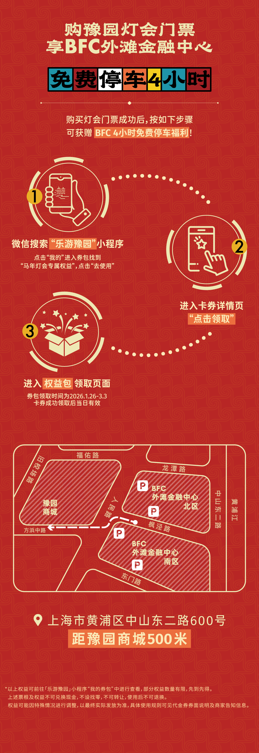 畅享价值约600元八大超值权益,票根可当“钱”花!价值60元的BFC外滩金融中心4小时免费停车让你赏灯停车不再难,累计100元超值买黄金券让你春节买黄金薅羊毛最划算,城隍庙定制福牌福气送到手,吃喝玩乐吃饭享尽30余家优惠,赏灯停车吃饭购物接福回家!更有豫园BFC双区加磅36天演出不间断,豫园和BFC年味市集、特色商户推出限定文创、年货好礼、联名产品多选择,更有提供电子赏灯导航服务、赛博科技体验等,一票让你体验“豫园·BFC·外滩”最地道最浓郁上海年味路线。