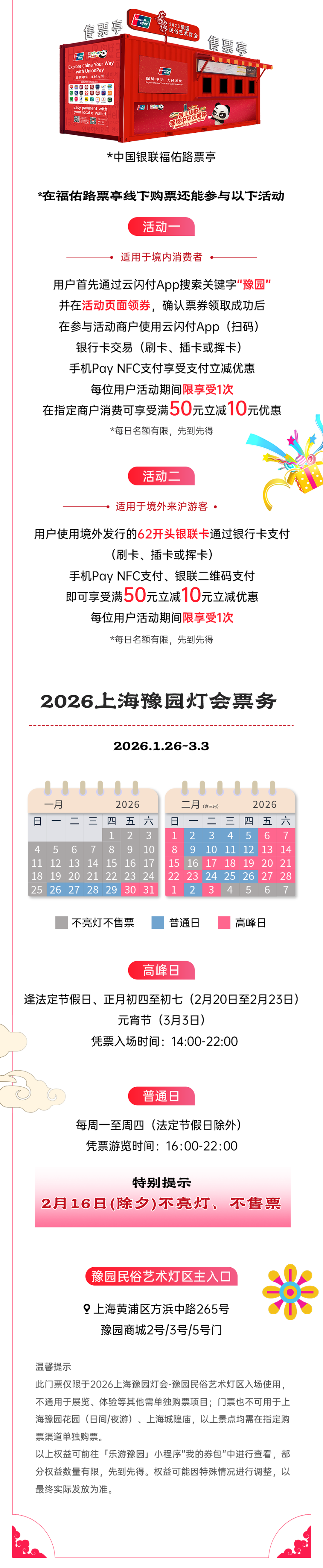 2026上海豫园灯会-豫园民俗艺术灯区的门票票根当“钱”花,权益享不停!不仅可以赏灯游园,更一站式搞定游、购、品、飨、玩、福、吃、趣,收获多重年味体验,轻松值回票价!