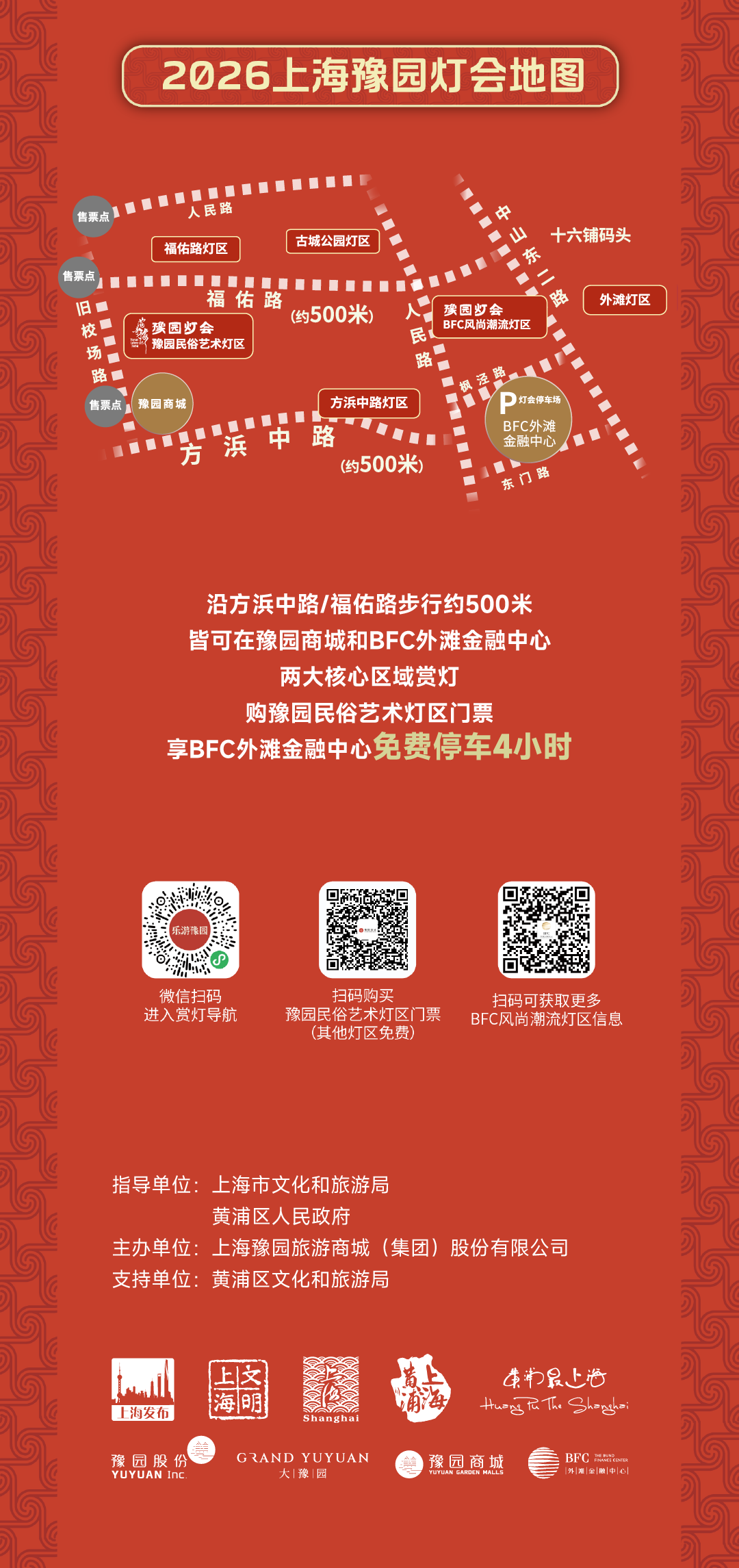 豫园民俗艺术灯区进入亮灯7天倒计时,一场持续36天的年味盛典即将为你点亮,是时候安排团圆之约,呼唤挚友亲朋,共同期待这场属于上海、更属于每个人的年味盛宴。年味远不止此处,2月1日将以BFC风尚潮流灯区为核心,联动豫园、古城公园、方浜中路、福佑路及外滩五大灯区,共同举办新春亮灯光影传递仪式,六大灯区交相辉映,共同点亮黄浦外滩,欢迎来「2026上海豫园灯会」共赴一场光与梦的新年。