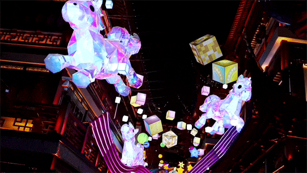 继续往里,抬头望向凝晖路的空中走廊,“舞马踏福” 灯组的三段式亮灯堪称视觉奇境。