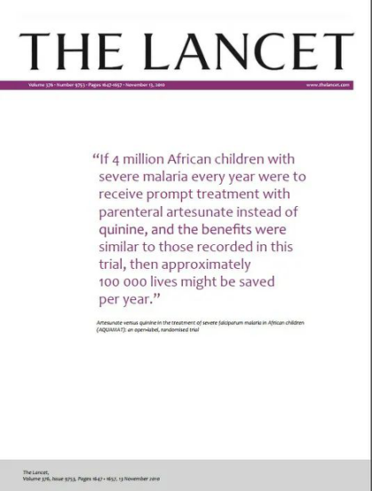 图3:2010年非洲多中心儿童重症疟疾治疗试验(AQUAMAT)结果在《柳叶刀》发表