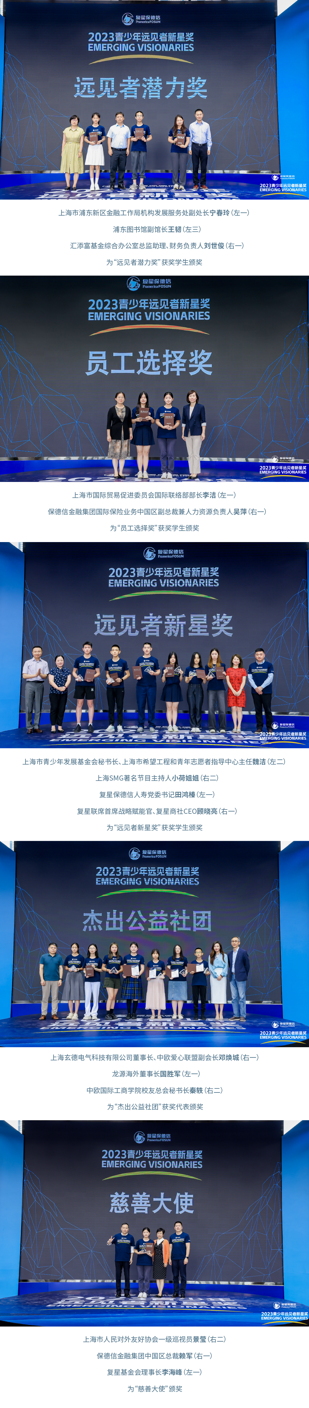 今年,青少年社区志愿奖升级为青少年远见者新星奖。这是升级后的首次峰会与颁奖典礼,共收到来自全国163所学校的457份申请,评选出2名“慈善大使”、10名“远见者新星奖”、16名“远见者潜力奖”和5个“杰出公益社团”,其中2名“慈善大使”于4月赴美国参与青少年远见者新星奖国际峰会。
