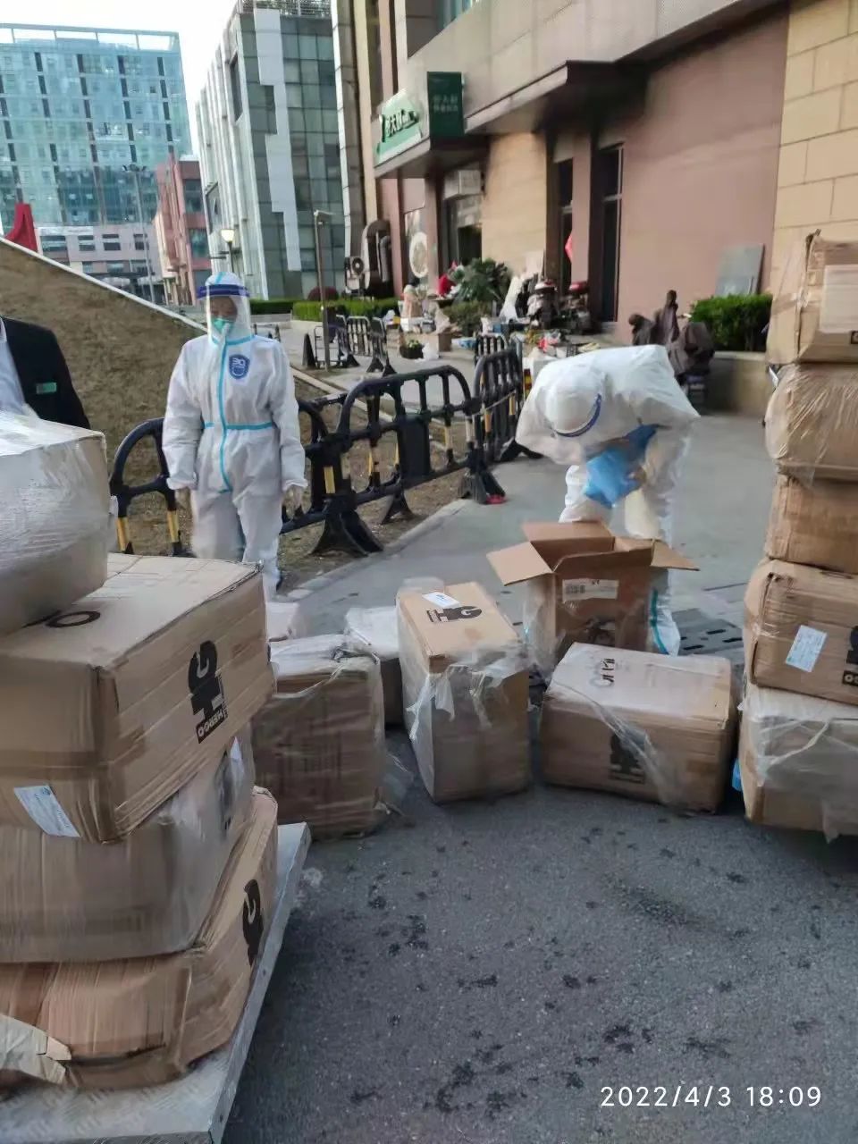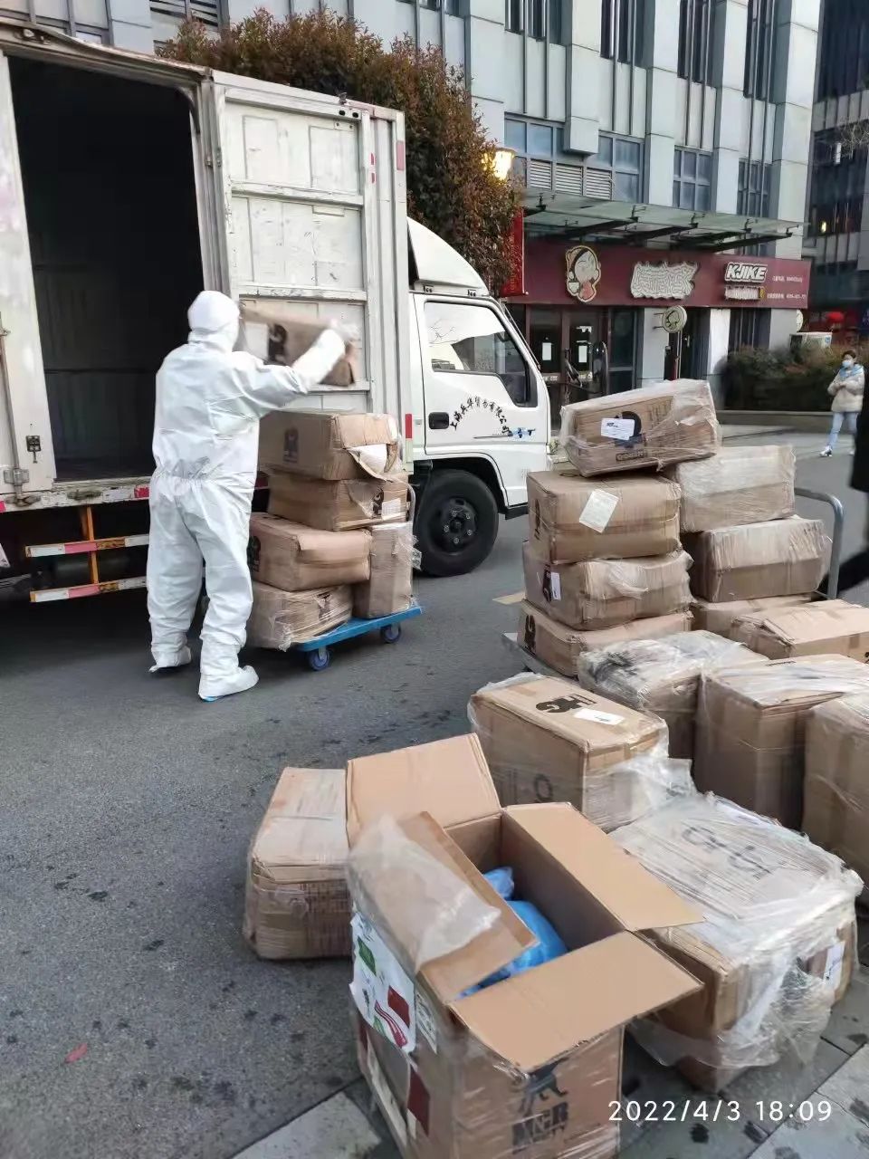 4月3日,浦江镇社区收到上海非凡 公益基金会(以下简称“非凡 基金会”)联合英科、正泰公益基金会捐赠的两份“社区防疫志愿者支持包”,第一批抵达的物资包括1000件防护服和1500双鞋套,足足用了一辆大货车才运送完。