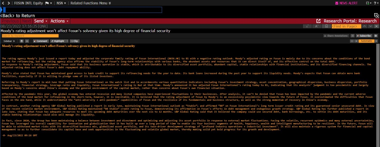 ムーディーズが発表した復星国際の格付けレポートを受け、キー・オピニオン・リーダー(KOL)であるアナリストは、ブルームバーグターミナルで復星国際に関する分析を行った。以下は、ブルームバーグターミナルの投稿から抜粋した記事となる。