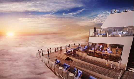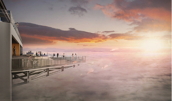 デッキが今までよりも前面にせり出し、さらに間近で雲海を鑑賞できるようになります。山を越えて流れ込み、一面を埋め尽くす雲海が目の前に広がる景色はまさに天空の絶景です。空中に浮いているようなデッキで、まるで、船に乗って雲の海に繰り出していくような気分を味わえます。