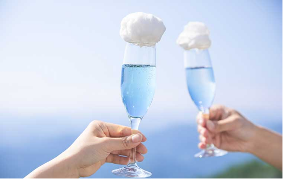 当日はテープカットや雲海テラスの歴史のご紹介をする「雲海テラス」リニューアルオープンセレモニーが行われます。セレモニーに参加されるお客さまには雲海スパークリングを無料で提供します。マスカットのほどよい酸味と炭酸の爽やかさが、口いっぱいに広がるノンアルコールカクテルです。早朝の青空をイメージしたドリンクと、グラスのふちに添えられた雲をイメージした綿あめが特徴です。雲スパークリングを片手に、空中にせり出す展望デッキから眺める景色を堪能できます。