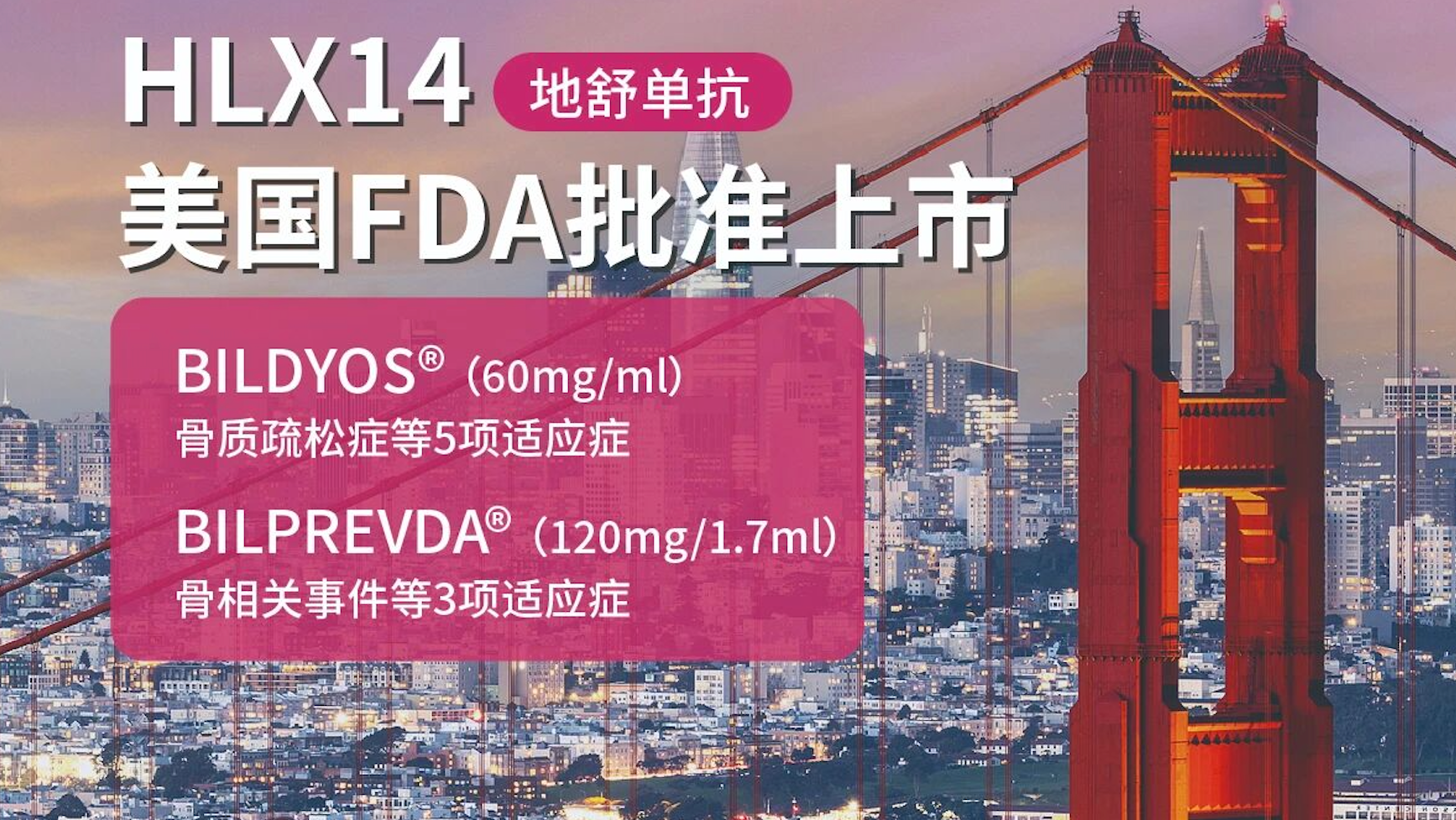 中国上海 & 美国新泽西州泽西市,2025年9月2日 —— 复宏汉霖与Organon今日共同宣布,美国食品药品监督管理局(FDA)已批准地舒单抗注射液(60mg/mL)BILDYOS®(denosumab-nxxp)和地舒单抗注射液(120mg/1.7mL)BILPREVDA®(denosumab-nxxp)的上市申请。