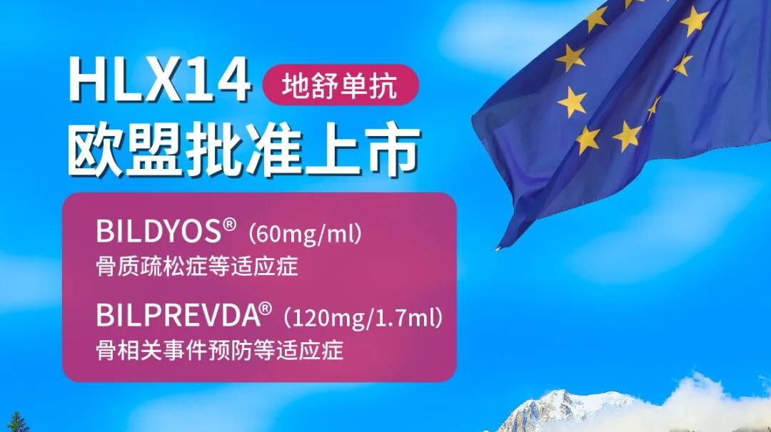 2025年9月19日,复宏汉霖与Organon今日联合宣布,欧盟委员会(EC)已批准地舒单抗注射液(60 mg/mL)BILDYOS®(denosumab)和地舒单抗注射液(120mg/1.7mL)BILPREVDA®(denosumab)的上市许可,两款产品分别为PROLIA®(地舒单抗)和XGEVA®(地舒单抗)的生物类似药,覆盖原研产品在欧盟已获批的所有适应症。